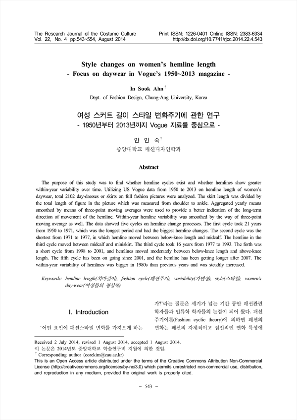 The purpose of this study was to find whether hemline cycles exist and whether hemlines show greater within-year variability over time. Utilizing US Vogue data from 1950 to 2013 on hemline length of women's daywear, total 2102 day-dresses or skirts on full fashion pictures were analyzed. The skirt length was divided by the total length of figure in the picture which was measured from shoulder to ankle. Aggregated yearly means smoothed by means of three-point moving averages were used to provide a better indication of the long-term direction of movement of the hemline. Within-year hemline variability was smoothed by the way of three-point moving average as well. The data showed five cycles on hemline change processes. The first cycle took 21 years from 1950 to 1971, which was the longest period and had the biggest hemline changes. The second cycle was the shortest from 1971 to 1977, in which hemline moved between below-knee length and midcalf. The hemline in the third cycle moved between midcalf and miniskirt. The third cycle took 16 years from 1977 to 1993. The forth was a short cycle from 1998 to 2001, and hemlines moved moderately between below-knee length and above-knee length. The fifth cycle has been on going since 2001, and the hemline has been getting longer after 2007. The within-year variability of hemlines was bigger in 1980s than previous years and was steadily increased.