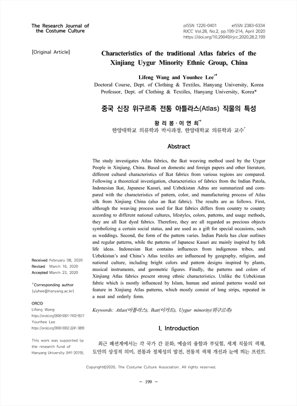 The study investigates Atlas fabrics, the Ikat weaving method used by the Uygur People in Xinjiang, China. Based on domestic and foreign papers and other literature, different cultural characteristics of Ikat fabrics from various regions are compared. Following a theoretical investigation, characteristics of fabrics from the Indian Patola, Indonesian Ikat, Japanese Kasuri, and Uzbekistan Adras are summarized and compared with the characteristics of pattern, color, and manufacturing process of Atlas silk from Xinjiang China (also an Ikat fabric). The results are as follows. First, although the weaving process used for Ikat fabrics differs from country to country according to different national cultures, lifestyles, colors, patterns, and usage methods, they are all Ikat dyed fabrics. Therefore, they are all regarded as precious objects symbolizing a certain social status, and are used as a gift for special occasions, such as weddings. Second, the form of the pattern varies. Indian Patola has clear outlines and regular patterns, while the patterns of Japanese Kasuri are mainly inspired by folk life ideas. Indonesian Ikat contains influences from indigenous tribes, and Uzbekistan’s and China’s Atlas textiles are influenced by geography, religion, and national culture, including bright colors and pattern designs inspired by plants, musical instruments, and geometric figures. Finally, the patterns and colors of Xinjiang Atlas fabrics present strong ethnic characteristics. Unlike the Uzbekistan fabric which is mostly influenced by Islam, human and animal patterns would not feature in Xinjiang Atlas patterns, which mostly consist of long strips, repeated in a neat and orderly form.