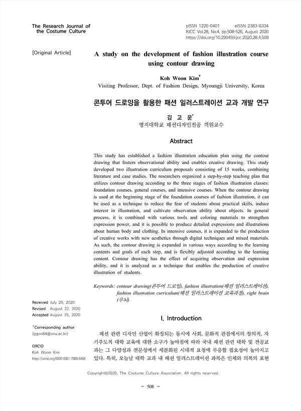This study has established a fashion illustration education plan using the contour drawing that fosters observational ability and enables creative drawing. This study developed two illustration curriculum proposals consisting of 15 weeks, combining literature and case studies. The researchers organized a step-by-step teaching plan that utilizes contour drawing according to the three stages of fashion illustration classes: foundation courses, general courses, and intensive courses. When the contour drawing is used at the beginning stage of the foundation courses of fashion illustration, it can be used as a technique to reduce the fear of students about practical skills, induce interest in illustration, and cultivate observation ability about objects. In general process, it is combined with various tools and coloring materials to strengthen expression power, and it is possible to produce detailed expressions and illustrations about human body and clothing. In intensive courses, it is expanded to the production of creative works with new aesthetics through digital techniques and mixed materials. As such, the contour drawing is expanded in various ways according to the learning contents and goals of each step, and is flexibly adjusted according to the learning content. Contour drawing has the effect of acquiring observation and expression ability, and it is analyzed as a technique that enables the production of creative illustration of students.
