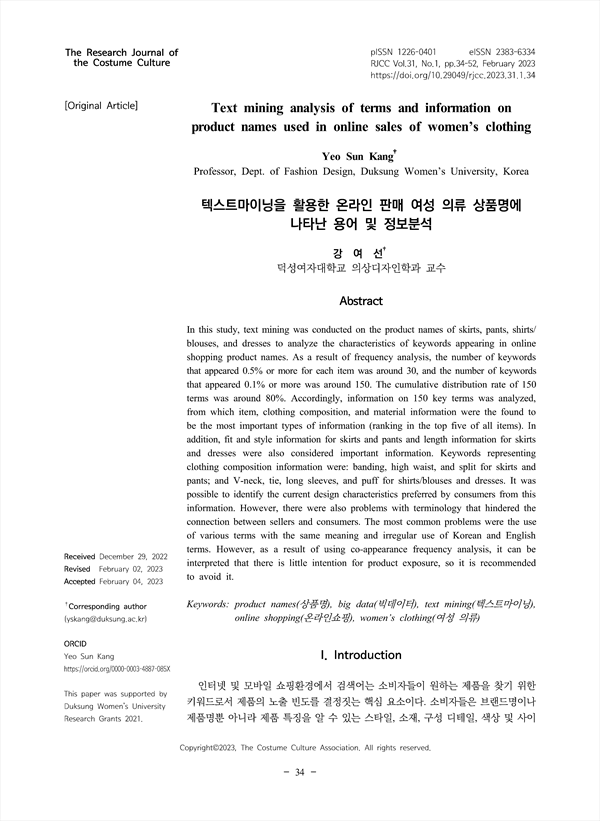 In this study, text mining was conducted on the product names of skirts, pants, shirts/ blouses, and dresses to analyze the characteristics of keywords appearing in online shopping product names. As a result of frequency analysis, the number of keywords that appeared 0.5% or more for each item was around 30, and the number of keywords that appeared 0.1% or more was around 150. The cumulative distribution rate of 150 terms was around 80%. Accordingly, information on 150 key terms was analyzed, from which item, clothing composition, and material information were the found to be the most important types of information (ranking in the top five of all items). In addition, fit and style information for skirts and pants and length information for skirts and dresses were also considered important information. Keywords representing clothing composition information were: banding, high waist, and split for skirts and pants; and V-neck, tie, long sleeves, and puff for shirts/blouses and dresses. It was possible to identify the current design characteristics preferred by consumers from this information. However, there were also problems with terminology that hindered the connection between sellers and consumers. The most common problems were the use of various terms with the same meaning and irregular use of Korean and English terms. However, as a result of using co-appearance frequency analysis, it can be interpreted that there is little intention for product exposure, so it is recommended to avoid it.