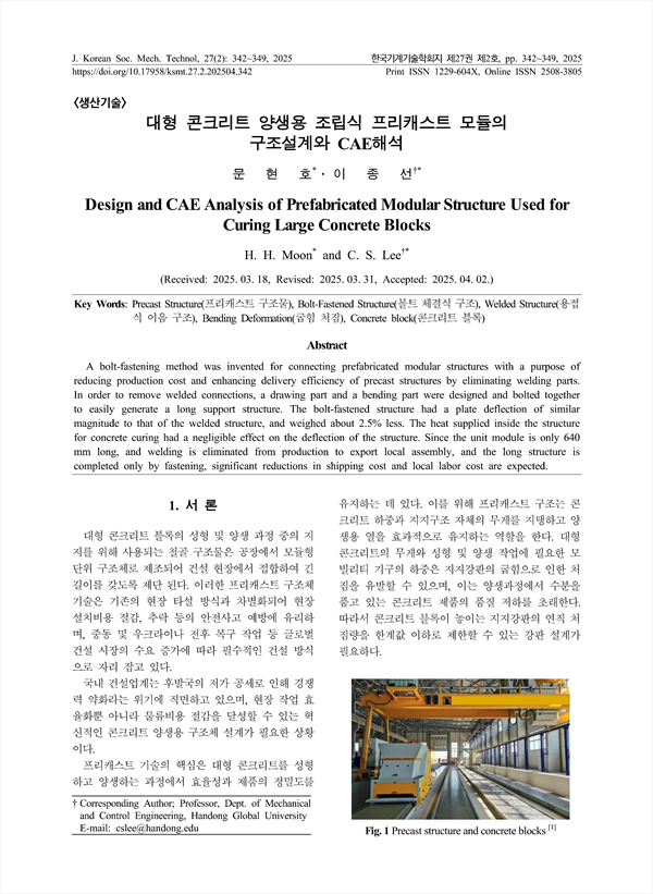 A bolt-fastening method was invented for connecting prefabricated modular structures with a purpose of reducing production cost and enhancing delivery efficiency of precast structures by eliminating welding parts. In order to remove welded connections, a drawing part and a bending part were designed and bolted together to easily generate a long support structure. The bolt-fastened structure had a plate deflection of similar magnitude to that of the welded structure, and weighed about 2.5% less. The heat supplied inside the structure for concrete curing had a negligible effect on the deflection of the structure. Since the unit module is only 640 mm long, and welding is eliminated from production to export local assembly, and the long structure is completed only by fastening, significant reductions in shipping cost and local labor cost are expected.