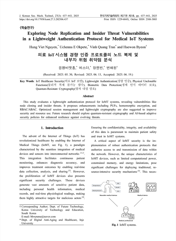 This study evaluates a lightweight authentication protocol for IoMT systems, revealing vulnerabilities like node cloning and insider threats. It proposes enhancements including PUFs, homomorphic encryption, and RBAC/ABAC. Optimized session management and lightweight cryptography are also suggested to improve security and resource use. Future research should explore quantum-resistant cryptography and AI-based adaptive security policies for enhanced resilience against evolving threats.