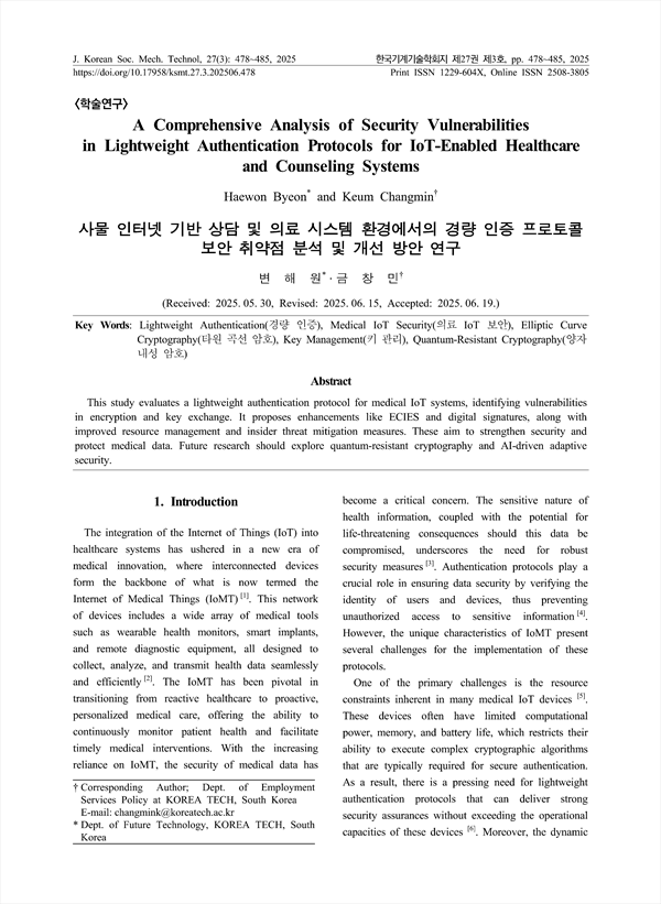 This study evaluates a lightweight authentication protocol for medical IoT systems, identifying vulnerabilities in encryption and key exchange. It proposes enhancements like ECIES and digital signatures, along with improved resource management and insider threat mitigation measures. These aim to strengthen security and protect medical data. Future research should explore quantum-resistant cryptography and AI-driven adaptive security.