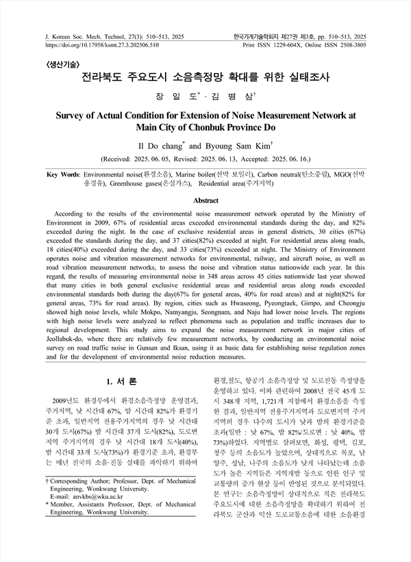 According to the results of the environmental noise measurement network operated by the Ministry of Environment in 2009, 67% of residential areas exceeded environmental standards during the day, and 82% exceeded during the night. In the case of exclusive residential areas in general districts, 30 cities (67%) exceeded the standards during the day, and 37 cities(82%) exceeded at night. For residential areas along roads, 18 cities(40%) exceeded during the day, and 33 cities(73%) exceeded at night. The Ministry of Environment operates noise and vibration measurement networks for environmental, railway, and aircraft noise, as well as road vibration measurement networks, to assess the noise and vibration status nationwide each year. In this regard, the results of measuring environmental noise in 348 areas across 45 cities nationwide last year showed that many cities in both general exclusive residential areas and residential areas along roads exceeded environmental standards both during the day(67% for general areas, 40% for road areas) and at night(82% for general areas, 73% for road areas). By region, cities such as Hwaseong, Pyeongtaek, Gimpo, and Cheongju showed high noise levels, while Mokpo, Namyangju, Seongnam, and Naju had lower noise levels. The regions with high noise levels were analyzed to reflect phenomena such as population and traffic increases due to regional development. This study aims to expand the noise measurement network in major cities of Jeollabuk-do, where there are relatively few measurement networks, by conducting an environmental noise survey on road traffic noise in Gunsan and Iksan, using it as basic data for establishing noise regulation zones and for the development of environmental noise reduction measures.