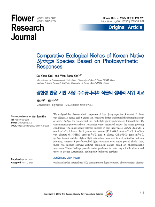 자생 수수꽃다리속(Syringa) 식물의 정원수 활용을 위한 기 초 광생리적 특성을 파악하기 위하여 동일한 재배환경에서 수 수꽃다리속 4종(버들개회나무, 수수꽃다리, 털개회나무, 섬개 회나무)의 광-광합성 반응과 세포 내 CO2 농도-광합성 반응을 측정하였다. 낮은 광도 환경에서 생육이 적합한 털개회나무 (29.5~281.3μmol·m-2·s-1), 섬개회나무(30.2~404.0μmol·m-2·s-1), 수수꽃다리(31.4~680.7μmol·m-2·s-1), 버들개회나무(26.3~794.3 μmol·m-2·s-1) 순으로 광-광합성 반응을 보였다. 버들개회나무 는 소교목 또는 관목성으로 자라는 환경 변화에 적응성이 높은 종으로, 광포화점이 높아 전광을 받는 양지에 식재하는 것이 적합하나 유년성 묘목은 비교적 내음성을 지닌다. 털개회나무는 반음지 환경에서도 광포화점에 도달하였다. 두 종(버들개회나 무, 털개회나무)은 광합성 반응에 따라 구분되는 생태적 지위를 가진 것을 확인하였다. 본 연구의 결과는 생태적, 지속 가능한 정원 조성을 위하여 수종 및 식재환경 선택의 기초 정보를 제공 하고자 한다.