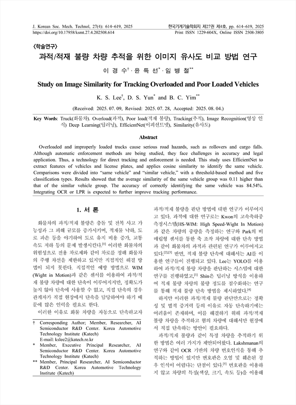 Overloaded and improperly loaded trucks cause serious road hazards, such as rollovers and cargo falls. Although automatic enforcement methods are being studied, they face challenges in accuracy and legal application. Thus, a technology for direct tracking and enforcement is needed. This study uses EfficientNet to extract features of vehicles and license plates, and applies cosine similarity to identify the same vehicle. Comparisons were divided into “same vehicle” and “similar vehicle,” with a threshold-based method and five classification types. Results showed that the average similarity of the same vehicle group was 0.11 higher than that of the similar vehicle group. The accuracy of correctly identifying the same vehicle was 84.54%. Integrating OCR or LPR is expected to further improve tracking performance.