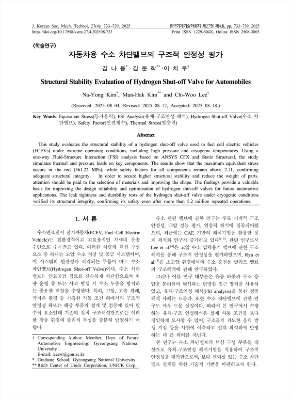 This study evaluates the structural stability of a hydrogen shut-off valve used in fuel cell electric vehicles (FCEVs) under extreme operating conditions, including high pressure and cryogenic temperatures. Using a one-way Fluid-Structure Interaction (FSI) analysis based on ANSYS CFX and Static Structural, the study simulates thermal and pressure loads on key components. The results show that the maximum equivalent stress occurs in the rod (361.22 MPa), while safety factors for all components remain above 2.11, confirming adequate structural integrity. In order to secure higher structural stability and reduce the weight of parts, attention should be paid to the selection of materials and improving the shape. The findings provide a valuable basis for improving the design reliability and optimization of hydrogen shut-off valves for future automotive applications. The leak tightness and durability tests of the hydrogen shut-off valve under cryogenic conditions verified its structural integrity, confirming its safety even after more than 5.2 million repeated operations.