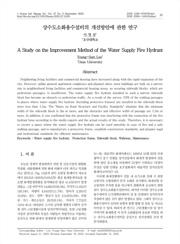 Neighboring living facilities and commercial housing have increased along with the rapid expansion of the city. However, unlike general apartment complexes and planned cities, most buildings are built on a narrow site in neighborhood living facilities and commercial housing areas, so securing sidewalk blocks, which are pedestrian passages, is insufficient. The water supply fire hydrant installed in such a narrow sidewalk block has become an obstacle to pedestrian traffic. As a result of the survey, 62% of the walking passages in places where water supply fire hydrant (including protective frames) are installed in the sidewalk block were less than 1.5m. The "Rules on Road Structure and Facility Standards" stipulate that the minimum width of the sidewalk block is 2m or more, and the obstacles and effective width of passage are 1.5m or more. In addition, it was confirmed that the protective frame was interfering with the connection of the fire hydrant hose according to the media reports and the actual results of this study. Therefore, it is necessary to secure a space where the water supply fire hydrant can be used smoothly in case of fire and a safe walking passage, and to manufacture a protective frame, establish construction standards, and prepare legal and institutional standards for efficient maintenance.
