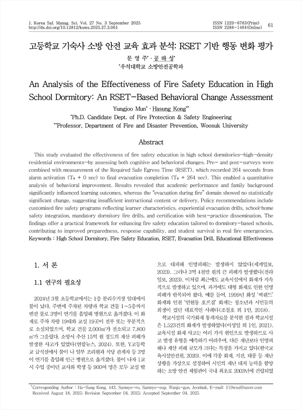 This study evaluated the effectiveness of fire safety education in high school dormitories—high-density residential environments—by assessing both cognitive and behavioral changes. Pre- and post-surveys were combined with measurement of the Required Safe Egress Time (RSET), which recorded 264 seconds from alarm activation (T₀ + 0 sec) to final evacuation completion (T₀ + 264 sec). This enabled a quantitative analysis of behavioral improvement. Results revealed that academic performance and family background significantly influenced learning outcomes, whereas the “evacuation during fire” domain showed no statistically significant change, suggesting insufficient instructional content or delivery. Policy recommendations include customized fire safety programs reflecting learner characteristics, experiential evacuation drills, school–home safety integration, mandatory dormitory fire drills, and certification with best-practice dissemination. The findings offer a practical framework for enhancing fire safety education tailored to dormitory-based schools, contributing to improved preparedness, response capability, and student survival in real fire emergencies.