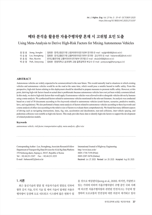 Autonomous vehicles are widely expected to be commercialized in the near future. This would naturally lead to situations in which existing vehicles and autonomous vehicles would be on the road at the same time, which would pose a notable hazard to traffic safety. From this perspective, high-risk factors relating to this deployment should be identified to prepare measures to promote traffic safety. However, at this point, deriving high-risk factors based on actual data is problematic because autonomous vehicles have not yet been widely commercialized. In this study, we derive high-risk factors that would apply if autonomous vehicles were allowed to drive alongside vehicles driven by humans using a meta-analysis. We synthesized factors related to autonomous vehicles mentioned in the relevant literature. An analysis was conducted based on a total of 58 documents according to five keywords related to autonomous vehicles (crash factors, scenarios, predictive models, laws, and regulations). We also performed a binary meta-analysis of factors related to autonomous vehicles according to these keywords and a meta-analysis of effect size according to the relative size of factors to evaluate them comprehensively. We found that many different aspects of driving such as navigating intersections, lanes, fog, rain, acceleration and deceleration, rear-end collisions, inter-vehicle spacing, and pedestrian collisions were notable as high-risk factors. This study provides basic data to identify high-risk factors to support the development of related prediction models.