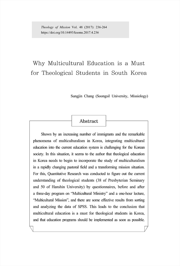 Shown by an increasing number of immigrants and the remarkable phenomena of multiculturalism in Korea, integrating multicultural education into the current education system is challenging for the Korean society. In this situation, it seems to the author that theological education in Korea needs to begin to incorporate the study of multiculturalism in a rapidly changing pastoral field and a transforming mission situation. For this, Quantitative Research was conducted to figure out the current understanding of theological students (38 of Presbyterian Seminary and 50 of Hanshin University) by questionnaires, before and after a three-day program on “Multicultural Ministry” and a one-hour lecture, “Multicultural Mission”, and there are some effective results from sorting and analyzing the data of SPSS. This leads to the conclusion that multicultural education is a must for theological students in Korea, and that education programs should be implemented as soon as possible.