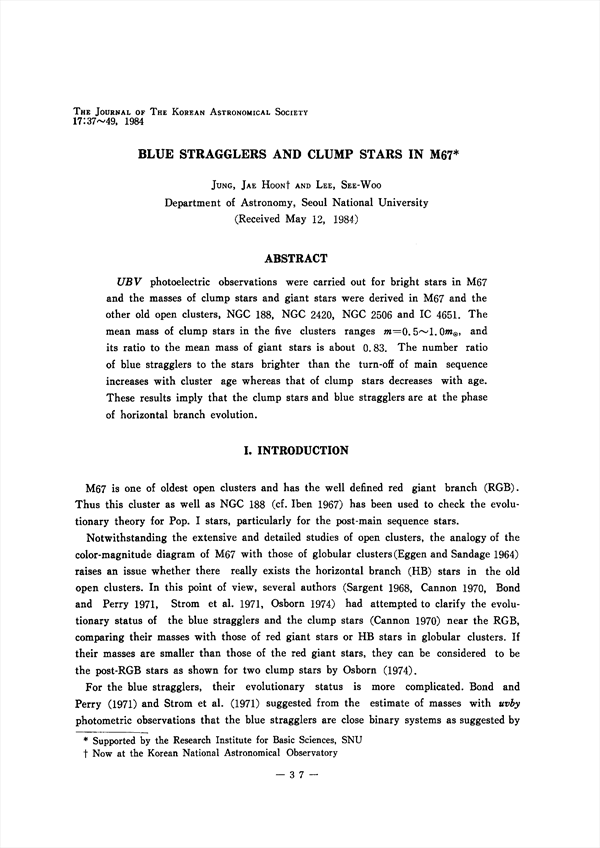 UBV photoelectric observations were carried out for bright stars in M67 and the masses of clump stars and giant stars were derived in M67 and the other old open clusters, NGC 188, NGC 2420, NGC 2506 and IC 4651. The mean mass of clump stars in the five clusters ranges m = 0.5 ∼ 1.0 m ⊙ , and its ratio to the mean mass of giant stars is about 0.83. The number ratio of blue stragglers to the stars brighter than the turn-off of main sequence increases with cluster age whereas that of clump stars decreases with age. These results imply that the clump stars and blue stragglers are at the phase of horizontal branch evolution.