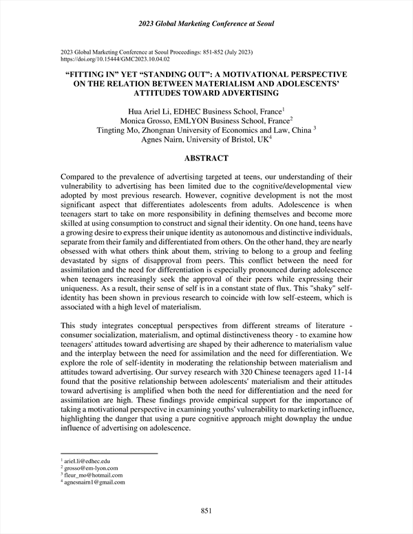 Compared to the prevalence of advertising targeted at teens, our understanding of their vulnerability to advertising has been limited due to the cognitive/developmental view adopted by most previous research. However, cognitive development is not the most significant aspect that differentiates adolescents from adults. Adolescence is when teenagers start to take on more responsibility in defining themselves and become more skilled at using consumption to construct and signal their identity. On one hand, teens have a growing desire to express their unique identity as autonomous and distinctive individuals, separate from their family and differentiated from others. On the other hand, they are nearly obsessed with what others think about them, striving to belong to a group and feeling devastated by signs of disapproval from peers. This conflict between the need for assimilation and the need for differentiation is especially pronounced during adolescence when teenagers increasingly seek the approval of their peers while expressing their uniqueness. As a result, their sense of self is in a constant state of flux. This "shaky" self-identity has been shown in previous research to coincide with low self-esteem, which is associated with a high level of materialism.