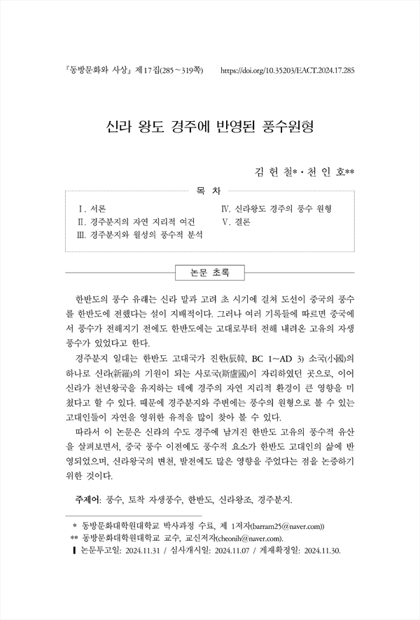 한반도의 풍수 유래는 신라 말과 고려 초 시기에 걸쳐 도선이 중국의 풍수 를 한반도에 전했다는 설이 지배적이다. 그러나 여러 기록들에 따르면 중국에 서 풍수가 전해지기 전에도 한반도에는 고대로부터 전해 내려온 고유의 자생 풍수가 있었다고 한다. 경주분지 일대는 한반도 고대국가 진한(辰韓, BC 1~AD 3) 소국(小國)의 하나로 신라(新羅)의 기원이 되는 사로국(斯盧國)이 자리하였던 곳으로, 이어 신라가 천년왕국을 유지하는 데에 경주의 자연 지리적 환경이 큰 영향을 미 쳤다고 할 수 있다. 때문에 경주분지와 주변에는 풍수의 원형으로 볼 수 있는 고대인들이 자연을 영위한 유적을 많이 찾아 볼 수 있다. 따라서 이 논문은 신라의 수도 경주에 남겨진 한반도 고유의 풍수적 유산 을 살펴보면서, 중국 풍수 이전에도 풍수적 요소가 한반도 고대인의 삶에 반 영되었으며, 신라왕국의 변천, 발전에도 많은 영향을 주었다는 점을 논증하기 위한 것이다.