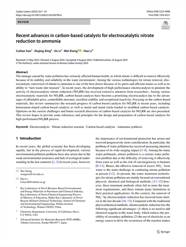 Recent advances in carbon‑based catalysts for electrocatalytic nitrate reduction to ammonia KCI 등재