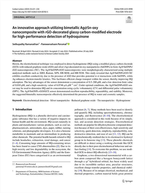 Herein, the electrochemical technique was employed to detect hydroquinone (HQ) using a modified glassy carbon electrode (GCE) with reduced graphene oxide (rGO) and silver (Ag)-decorated tin oxy-nanoparticles (SnONPs) to form Ag@SnONPs/ rGO nanocomposites (NC). The Ag@SnONPs/rGO nanocomposites were morphologically characterized using multiple analytical methods such as XRD, Raman, XPS, HR-SEM, and HR-TEM. This study revealed that Ag@SnONPs/rGO-NC exhibits excellent conductivity due to the presence of rGO that provides potential π–π interactions with SnONPs, while Ag enhances electron-transfer kinetics. This facilitates efficient charge transport within the sensor, thereby improving HQ adsorption. The key advantages of the sensor demonstrate a concentration of 0.5–200 μM, and a low detection limit value of 0.010 μM, and a high sensitivity value of 6.0746 μA μM−1 cm2. Under optimal conditions, the Ag@SnONPs/rGO sensor may be used to determine HQ and its concentration using cyclic voltammetry (CV) and differential pulse voltammetry (DPV). The Ag@SnONPs-rGO/GCE sensor demonstrated excellent reproducibility, repeatability, and stability. Moreover, the suggested bimetallic nanocomposite effectively determined the presence of HQ in water and cosmetic samples.