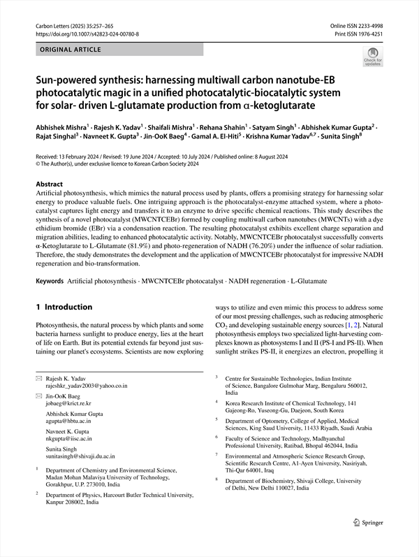 Artificial photosynthesis, which mimics the natural process used by plants, offers a promising strategy for harnessing solar energy to produce valuable fuels. One intriguing approach is the photocatalyst-enzyme attached system, where a photocatalyst captures light energy and transfers it to an enzyme to drive specific chemical reactions. This study describes the synthesis of a novel photocatalyst (MWCNTCEBr) formed by coupling multiwall carbon nanotubes (MWCNTs) with a dye ethidium bromide (EBr) via a condensation reaction. The resulting photocatalyst exhibits excellent charge separation and migration abilities, leading to enhanced photocatalytic activity. Notably, MWCNTCEBr photocatalyst successfully converts α-Ketoglutarate to L-Glutamate (81.9%) and photo-regeneration of NADH (76.20%) under the influence of solar radiation. Therefore, the study demonstrates the development and the application of MWCNTCEBr photocatalyst for impressive NADH regeneration and bio-transformation.