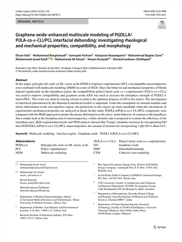 In this paper, poly(glycolic acid–co-DL–lactic acid) (PGDLLA)/poly(ɛ-caprolactone) (PCL) incompatible nanocomposites were combined with multiscale modeling (MSM) in a ratio of 80/20. Since the behavior and mechanical properties of blends depend significantly on the interphase region, the compatibilizer poly(l,l-lactic acid–co-ɛ-caprolactone) (P(lLA-co-ɛ-CL)) was used to improve compatibility and graphene oxide (GO) was used to increase the interphase strength of PGDLLA matrix/PCL. This work was done by mixing solvent to achieve the optimum disperse of GO in the matrix. The investigation of interfacial phenomenon by the theoretical interfacial models is important. Under the assumption of constant modulus and elastic deformation in the zero interface region, the predictions in this region are more unreliable when the calculations of experimental mechanical properties are analyzed in detail. In this study, PGDLLA/P(lLA-co-ɛ-CL)/PCL compounds were compared with the MSM approach to predict the plastic deformation in the stress–strain behavior. In contrast to the hypothesis that a simple look at the interphase area in nanocomposites, a finite element code is proposed to evaluate the efficiency of the interphase area. Both experimental results and FEM analysis showed that Young’s modulus increases by incorporating GO into GO/PGDLLA/P(lLA-co-ɛ-CL)/PCL nanocomposites; the amount of increase for incorporating 1 phr GO is about 61%.