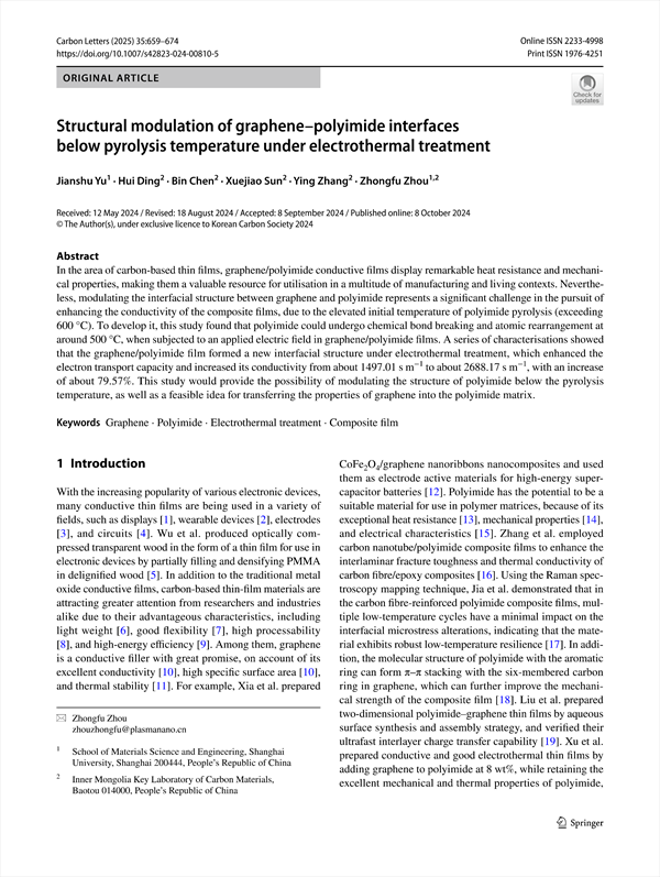 In the area of carbon-based thin films, graphene/polyimide conductive films display remarkable heat resistance and mechanical properties, making them a valuable resource for utilisation in a multitude of manufacturing and living contexts. Nevertheless, modulating the interfacial structure between graphene and polyimide represents a significant challenge in the pursuit of enhancing the conductivity of the composite films, due to the elevated initial temperature of polyimide pyrolysis (exceeding 600 °C). To develop it, this study found that polyimide could undergo chemical bond breaking and atomic rearrangement at around 500 °C, when subjected to an applied electric field in graphene/polyimide films. A series of characterisations showed that the graphene/polyimide film formed a new interfacial structure under electrothermal treatment, which enhanced the electron transport capacity and increased its conductivity from about 1497.01 s m− 1 to about 2688.17 s m− 1, with an increase of about 79.57%. This study would provide the possibility of modulating the structure of polyimide below the pyrolysis temperature, as well as a feasible idea for transferring the properties of graphene into the polyimide matrix.