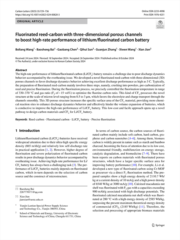 The high-rate performance of lithium/fluorinated carbon (Li/CFx) battery remains a challenge due to poor discharge dynamics behavior accompanied by the overheating issue. We developed a novel fluorinated reed-carbon with three-dimensional (3D) porous channels to favor discharge dynamics behavior achieving excellent discharge performance as high as 5 C. Typically, the preparation of fluorinated reed-carbon mainly involves three steps, namely, crushing into powders, pre-carbonization of reed and precise fluorination. During the fluorination process, we precisely controlled the fluorination temperature in range of 330–370 °C and gas ratio ( F2 of ~ 15 vol%) to optimize the fluorine carbon ratio. This kind of CFx possesses the novel structure at the scale of micron level ranging from 0.5 to 3 μm, which favors the electrolyte and charge transport through the channels smoothly. This 3D porous structure increases the specific surface area of the CFx material, providing more chemical reaction sites to enhance discharge dynamics behavior and effectively hinder the volume expansion of batteries, which is conductive to improve the high-rate performance of Li/CFx battery. This low-cost and facile approach opens up a novel pathway to design carbon materials and CFx for Li/CFx battery.
