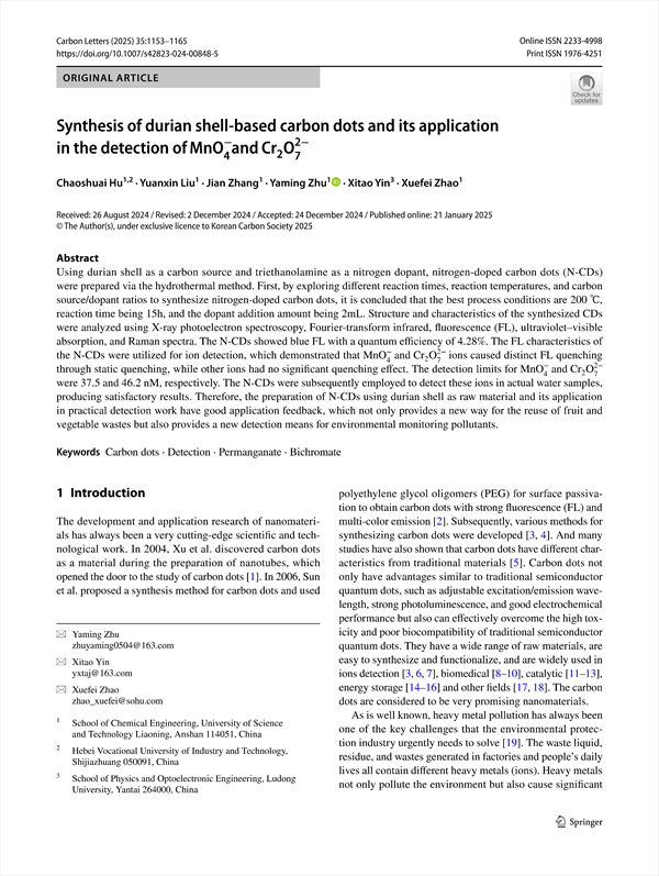 Synthesis of durian shell‑based carbon dots and its application in the detection of MnO− 4and Cr2O2− 7 KCI 등재
