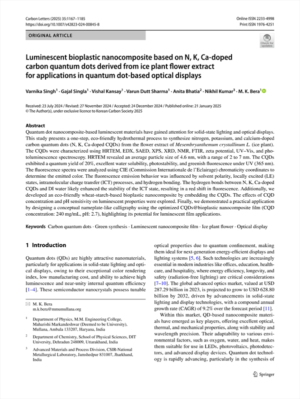 Luminescent bioplastic nanocomposite based on N, K, Ca‑doped carbon quantum dots derived from ice plant flower extract for applications in quantum dot‑based optical displays KCI 등재