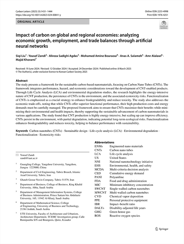 The study presents a framework for the sustainable carbon-based nanomaterials, focusing on Carbon Nano Tubes (CNTs). The framework integrates performance, hazard, and economic considerations toward the development of CNT-enabled products. Through Life Cycle Analysis (LCA) and environmental degradation studies, the research highlights the energy-intensive nature of CNT production, the persistence of CNTs in the environment, and the associated ecotoxicity risks. Functionalization of CNTs is emphasized as a crucial strategy to enhance biodegradability and reduce toxicity. The study also addresses the economic trade-offs, noting that while CNTs offer superior functional performance, their high production costs and energy demands must be carefully managed. The proposed framework aims to ensure that CNTs maximize their benefits while minimizing their environmental and health impacts, thereby supporting the sustainable advancement of carbon nanomaterials in various applications. The study found that CNT production is highly energy-intensive, but scaling up can improve efficiency. CNTs persist in the environment, with partial degradation, indicating potential long-term ecological risks. Functionalization enhances biodegradability and reduces toxicity, helping to balance performance with sustainability.