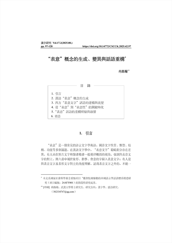 ‘Ideographic’ originally referred to the expression of meaning or the transmission of thoughts and intentions. Its association with the issue of Chinese characters has undergone a complex process of discursive evolution. Western academia has sometimes used Chinese characters as a representative of ideographic writing systems to support the three-stage theory of world writing development, sometimes to support the construction of modern linguistic theories, and sometimes to support discourses on Chinese character education. After the Western concept of ‘ideographic writing’ entered China, the academic community, based on the structure and function of Chinese character symbols, developed a sub-conceptual system centered on ‘ideographic nature,’ refined the scope of discourse to adapt to different discursive contexts, and perfected the terminology system to create a distinctive conceptual framework; clarifying discursive positions, and redefining interpretive subjectivity. This process has localised the concept of ‘ideographic,’ forming a distinctive Chinese perspective on ideographic characters and research methodologies. The experience of the generation, variation, and reconstruction of the ‘ideographic’ concept provides important references for the construction of a Chinese-specific theoretical discourse in the field of writing systems.