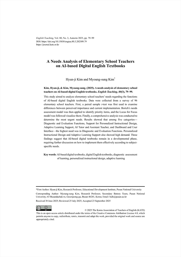 This study aimed to analyze elementary school teachers’ needs regarding the functions of AI-based digital English textbooks. Data were collected from a survey of 96 elementary school teachers. First, a paired sample t-test was first used to examine differences between perceived importance and current implementation. Borich’s needs assessment model was then applied to identify priority items, and the Locus for Focus model was followed visualize them. Finally, a comprehensive analysis was conducted to determine the most urgent needs. Results showed that among five categories—Diagnostic and Evaluation Functions, Support for Personalized Instructional Design, Adaptive Learning Support, AI Tutor and Assistant Teacher, and Dashboard and User Interface—the highest need was in Diagnostic and Evaluation Functions. Personalized Instructional Design and Adaptive Learning Support also showed high demand. These findings suggest that AI-based digital textbooks remain in a developmental phase, requiring further discussion on how to implement them effectively according to subject-specific needs.