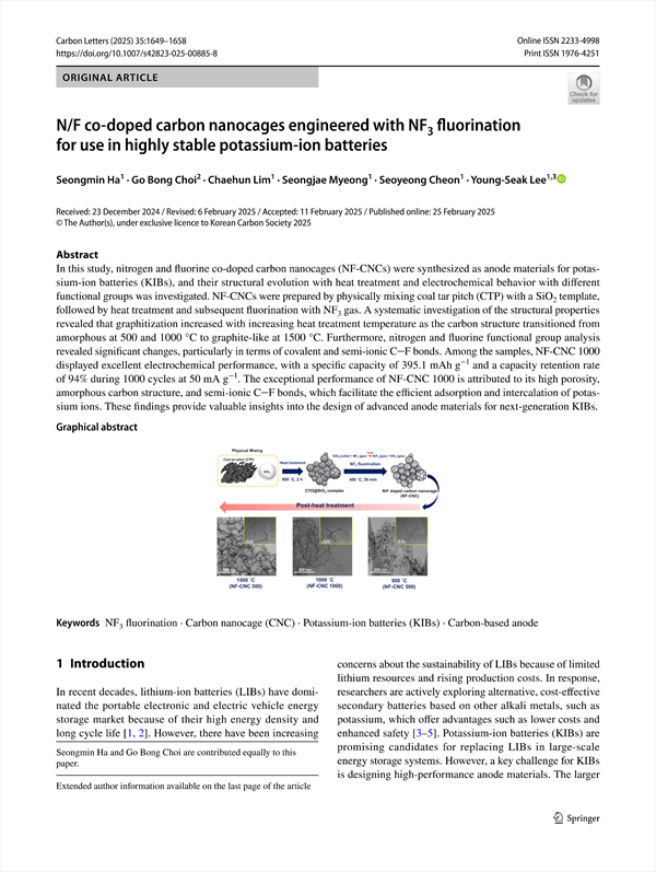 N/F co‑doped carbon nanocages engineered with NF3 fluorination for use in highly stable potassium‑ion batteries KCI 등재