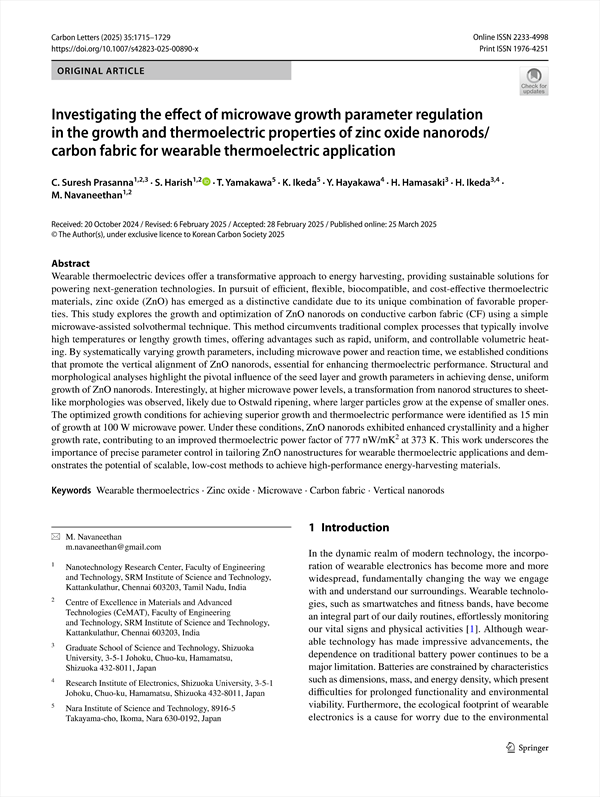 • C. Suresh Prasanna(Nanotechnology Research Center, Faculty of Engineering and Technology, SRM Institute of Science and Technology, Kattankulathur, Chennai 603203, Tamil Nadu, India, Centre of Excellence in Materials and Advanced Technologies (CeMAT), Faculty of Engineering and Technology, SRM Institute of Science and Technology, Kattankulathur, Chennai 603203, India, Graduate School of Science and Technology, Shizuoka University, 3‑5‑1 Johoku, Chuo‑ku, Hamamatsu, Shizuoka 432‑8011, Japan)