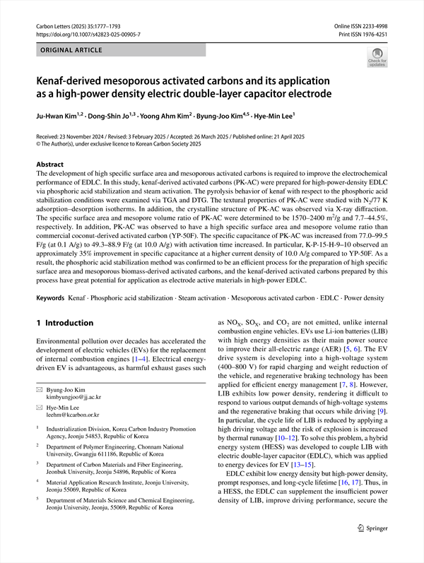 The development of high specific surface area and mesoporous activated carbons is required to improve the electrochemical performance of EDLC. In this study, kenaf-derived activated carbons (PK-AC) were prepared for high-power-density EDLC via phosphoric acid stabilization and steam activation. The pyrolysis behavior of kenaf with respect to the phosphoric acid stabilization conditions were examined via TGA and DTG. The textural properties of PK-AC were studied with N2/ 77 K adsorption–desorption isotherms. In addition, the crystalline structure of PK-AC was observed via X-ray diffraction. The specific surface area and mesopore volume ratio of PK-AC were determined to be 1570–2400 m2/ g and 7.7–44.5%, respectively. In addition, PK-AC was observed to have a high specific surface area and mesopore volume ratio than commercial coconut-derived activated carbon (YP-50F). The specific capacitance of PK-AC was increased from 77.0–99.5 F/g (at 0.1 A/g) to 49.3–88.9 F/g (at 10.0 A/g) with activation time increased. In particular, K-P-15-H-9–10 observed an approximately 35% improvement in specific capacitance at a higher current density of 10.0 A/g compared to YP-50F. As a result, the phosphoric acid stabilization method was confirmed to be an efficient process for the preparation of high specific surface area and mesoporous biomass-derived activated carbons, and the kenaf-derived activated carbons prepared by this process have great potential for application as electrode active materials in high-power EDLC.