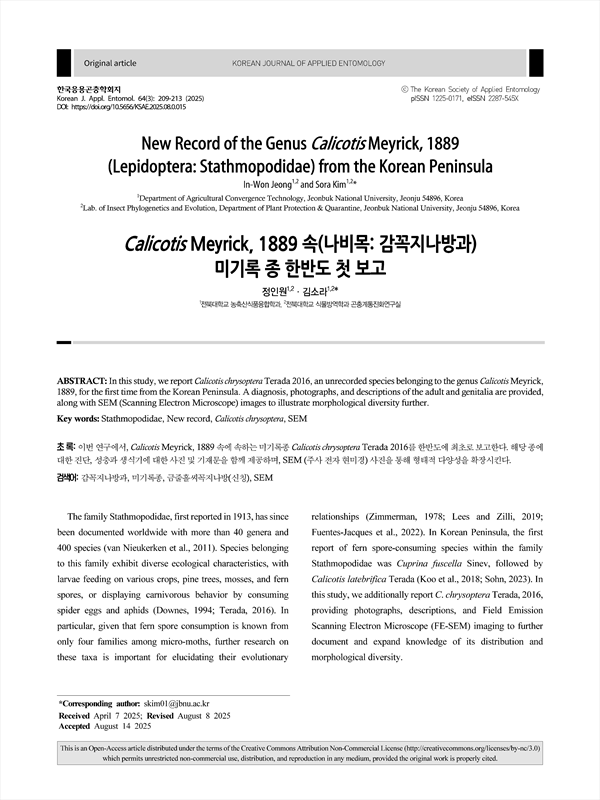 이번 연구에서, Calicotis Meyrick, 1889 속에 속하는 미기록종 Calicotis chrysoptera Terada 2016를 한반도에 최초로 보고한다. 해당 종에 대한 진단, 성충과 생식기에 대한 사진 및 기재문을 함께 제공하며, SEM (주사 전자 현미경) 사진을 통해 형태적 다양성을 확장시킨다.