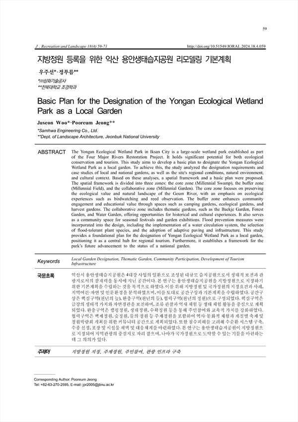The Yongan Ecological Wetland Park in Iksan City is a large-scale wetland park established as part of the Four Major Rivers Restoration Project. It holds significant potential for both ecological conservation and tourism. This study aims to develop a basic plan to designate the Yongan Ecological Wetland Park as a local garden. To achieve this, the study analyzed the designation requirements and case studies of local and national gardens, as well as the site's regional conditions, natural environment, and cultural context. Based on these analyses, a spatial framework and a basic plan were proposed. The spatial framework is divided into three zones: the core zone (Millennial Swamp), the buffer zone (Millennial Field), and the collaborative zone (Millennial Garden). The core zone focuses on preserving the ecological value and natural landscape of the Geum River, with an emphasis on ecological experiences such as birdwatching and reed observation. The buffer zone enhances community engagement and educational value through spaces such as camping gardens, ecological gardens, and harvest gardens. The collaborative zone includes thematic gardens, such as the Baekje Garden, Forest Garden, and Water Garden, offering opportunities for historical and cultural experiences. It also serves as a community space for seasonal festivals and garden exhibitions. Flood prevention measures were incorporated into the design, including the implementation of a water circulation system, the selection of flood-tolerant plant species, and the adoption of adaptive paving and infrastructure. This study provides a foundational plan for the designation of Yongan Ecological Wetland Park as a local garden, positioning it as a central hub for regional tourism. Furthermore, it establishes a framework for the park’s future advancement to the status of a national garden.