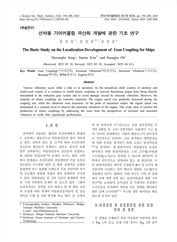 Various vibrations occur while a ship is in operation. In the propulsion shaft systems of medium and small-sized vessels, it is common to install elastic couplings to prevent fluctuating torque from being directly transmitted to the reduction gear system and to avoid damage caused by torsional vibrations. However, the majority of elastic couplings are currently imported. The engine speed was gradually increased during the coupling test, while the vibrations were measured. At the point of maximum output, the engine speed was maintained at a constant level to observe the structural vibrations of the engine. This study aims to localize the production of elastic couplings by addressing the issue from the perspectives of torsional and structural vibrations to verify their operational performance.