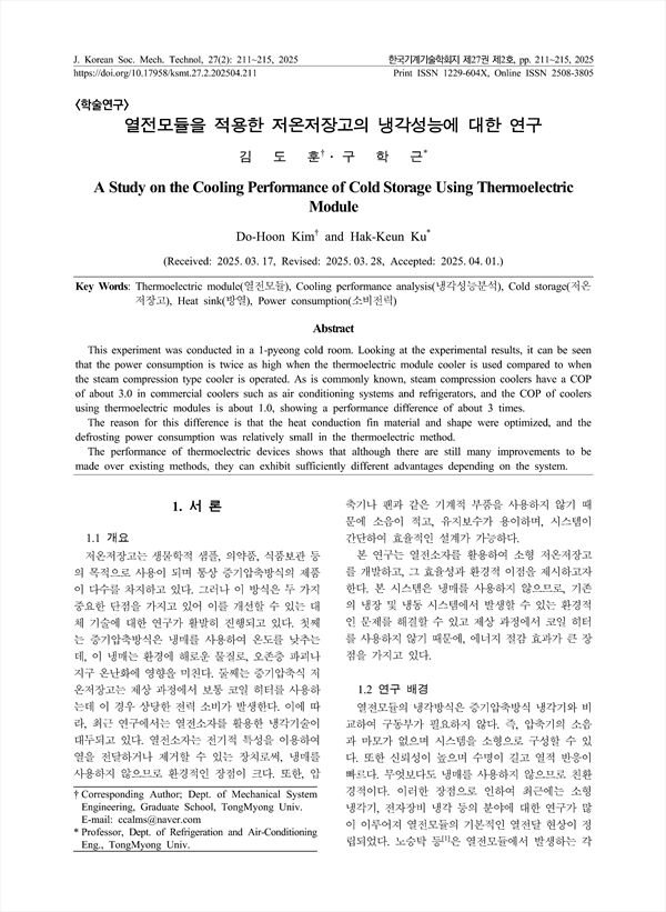 This experiment was conducted in a 1-pyeong cold room. Looking at the experimental results, it can be seen that the power consumption is twice as high when the thermoelectric module cooler is used compared to when the steam compression type cooler is operated. As is commonly known, steam compression coolers have a COP of about 3.0 in commercial coolers such as air conditioning systems and refrigerators, and the COP of coolers using thermoelectric modules is about 1.0, showing a performance difference of about 3 times. The reason for this difference is that the heat conduction fin material and shape were optimized, and the defrosting power consumption was relatively small in the thermoelectric method. The performance of thermoelectric devices shows that although there are still many improvements to be made over existing methods, they can exhibit sufficiently different advantages depending on the system.