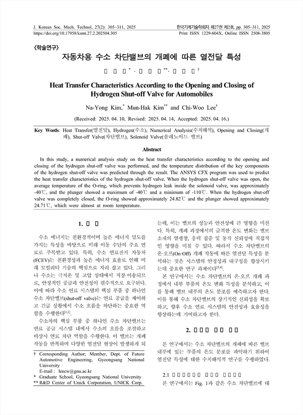 In this study, a numerical analysis study on the heat transfer characteristics according to the opening and closing of the hydrogen shut-off valve was performed, and the temperature distribution of the key components of the hydrogen shut-off valve was predicted through the result. The ANSYS CFX program was used to predict the heat transfer characteristics of the hydrogen shut-off valve. When the hydrogen shut-off valve was open, the average temperature of the O-ring, which prevents hydrogen leak inside the solenoid valve, was approximately -40℃, and the plunger showed a maximum of -40℃ and a minimum of -110℃. When the hydrogen shut-off valve was completely closed, the O-ring showed approximately 24.82℃ and the plunger showed approximately 24.71℃, which were almost at room temperature.
