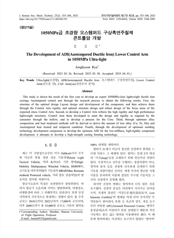 This study is shown the result of the first year to develop an export 1050MPa-class lightweight ductile iron castings Austempered control arm through the research process to obtain the following results. First, the structure of the optimal design Layout design and development of the component, and then achieve them through the Control Arm rigidity and optimal structure design and robust design of the focus areas of the expected stress Control Arm. Second, to develop a Control Arm reflects the high rigidity and high performance lightweight structures. Control Arm them developed to meet the design and rigidity as required by the consumer through the hollow, and to develop a process for the Core. Third, through optimum alloy composition and heat treatment methods will be derived to derive the amount of iron alloy (Cu, Ni, Mo) and Austempered heat treated and tempered condition. Fourth, through the development of optimum molding technology development component to develop the optimum ADI for the low-stiffness, high-rigidity component development, it attempts to develop a high-strength casting forming technology.