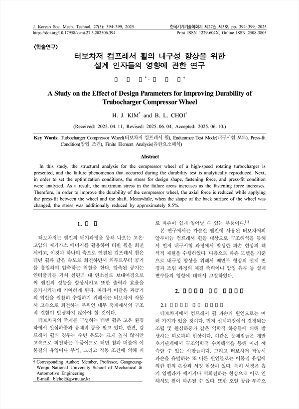 터보차저 컴프레서 휠의 내구성 향상을 위한 설계 인자들의 영향에 관한 연구 KCI 등재