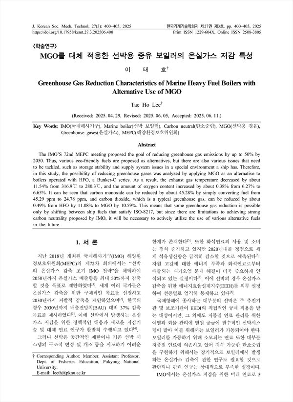 The IMO’S 72nd MEPC meeting proposed the goal of reducing greenhouse gas emissions by up to 50% by 2050. Thus, various eco-friendly fuels are proposed as alternatives, but there are also various issues that need to be tackled, such as storage stability and supply system issues in a special environment a ship has. Therefore, in this study, the possibility of reducing greenhouse gases was analyzed by applying MGO as an alternative to boilers operated with HFO, a Bunker-C series. As a result, the exhaust gas temperature decreased by about 11.54% from 316.9℃ to 280.3℃, and the amount of oxygen content increased by about 0.38% from 6.27% to 6.65%. It can be seen that carbon monoxide can be reduced by about 45.28% by simply converting fuel from 45.29 ppm to 24.78 ppm, and carbon dioxide, which is a typical greenhouse gas, can be reduced by about 0.49% from HFO by 11.08% to MGO by 10.59%. This means that some greenhouse gas reduction is possible only by shifting between ship fuels that satisfy ISO-8217, but since there are limitations to achieving strong carbon neutrality proposed by IMO, it will be necessary to actively utilize the use of various alternative fuels in the future.