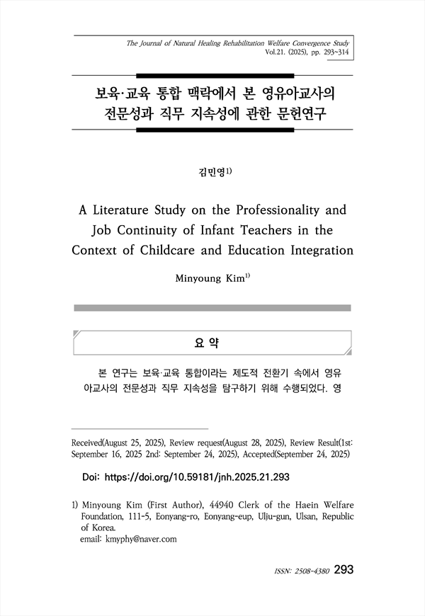 본 연구는 보육·교육 통합이라는 제도적 전환기 속에서 영유 아교사의 전문성과 직무 지속성을 탐구하기 위해 수행되었다. 영유아교사는 영유아 발달에 핵심적인 역할을 담당하는 전문 인력 으로, 최근 제도 변화와 사회적 요구의 확대 속에서 직무 환경의 변화를 경험하고 있다. 문헌연구 방법을 활용하여 2000년부터 2024년까지 발표된 국내외 연구를 수집·분석하였다. 문헌은 영 유아교사의 전문성과 직무 지속성을 다룬 연구와 보육·교육 통합 관련 연구를 포함하였으며, 비학술적 자료는 제외하였다. 주요 검색어는 “영유아교사”, “보육·교육 통합”, “전문성”, “직무 지속성”, “이직의도”, “professionalism”, “job retention”, “ECEC integ ration” 등이었으며, 수집된 문헌은 전문성, 직무 지속성, 제도 변화의 세 범주로 분류·검토하였다. 연구 결과, 첫째 보육·교육 통합은 영유아교사의 전문성 인식 과 직무 만족을 강화하는 긍정적 요인으로 확인되었다. 둘째, 직 무 지속성은 조직문화·동료 협력 등 조직적 자원과 부모와의 소통 등 관계적 자원에 의해 크게 영향을 받았다. 셋째, 제도 변화는 영유아교사들에게 기대와 불안을 동시에 제공하는 양면적 특성을 지니는 것으로 나타났다. 이러한 결과는 국내외 선행연구의 결론 을 지지하면서도, 일부 연구에서 강조된 개인적 노력만으로는 직 무 지속성을 설명하기 어렵다는 상반된 논의도 함께 보여주었다. 결론적으로 본 연구는 보육·교육 통합 맥락에서 영유아교사의 전문성과 직무 지속성을 종합적으로 조명하였으며, 제도 변화 과정 에서 영유아교사의 정체성과 직무 환경을 균형 있게 고려해야 함 을 시사한다. 다만 문헌연구라는 한계를 지니므로, 향후 연구에서 는 실증적 자료를 활용한 양적·질적 연구가 병행될 필요가 있다.