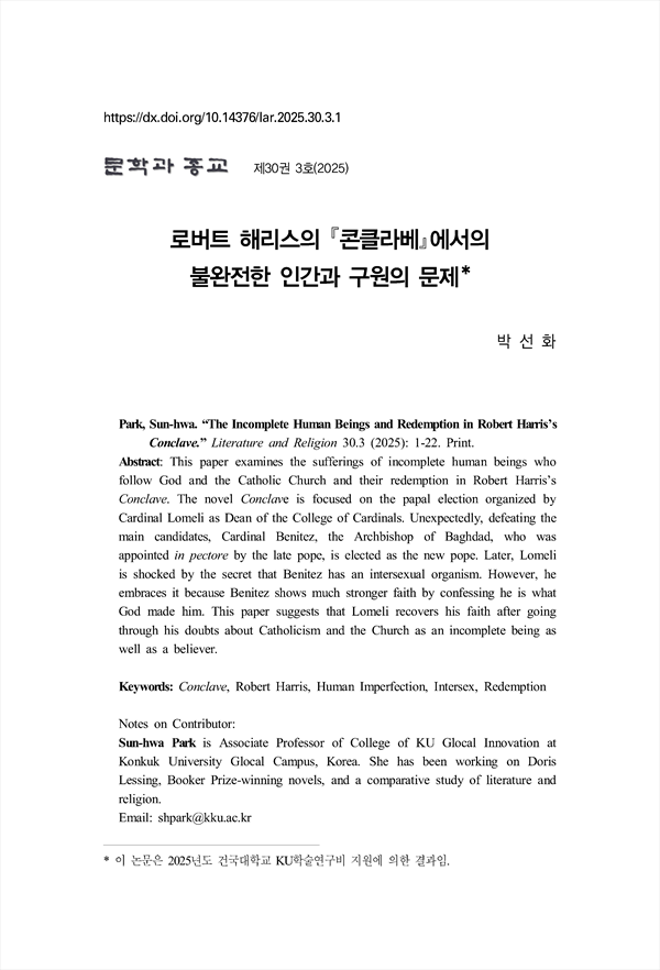 본 논문에서는 로버트 해리스의 콘클라베에서 가톨릭교회를 섬기는 불완 전한 인간의 고통 그리고 구원 문제를 살펴보고자 한다. 콘클라베는 교황이 서거하면서 추기경 단장인 야코포 로멜리를 중심으로 새로운 교황을 선출하는 과정을 중점적으로 다룬다. 쟁쟁한 후보를 물리치고 예상과 달리, 전혀 의도하 지 않고 또 마지막으로 참석한 의중 결정의 바그다드의 추기경 빈센트 베니테 즈가 새로운 교황으로 선출된다. 로멜리는 베니테즈가 인터섹스라는 사실을 발 견하고 충격에 사로잡히지만, 자신을 하느님의 작품이라고 믿는 베니테즈의 믿 음과 신앙에 굴복한다. 이러한 선거 과정을 고찰하면서 로멜리가 성직자로서 동 시에 불완전한 인간으로서 내적 고민과 갈등을 겪고 진정한 종교인으로 거듭나 는 모습을 살펴보려 한다.