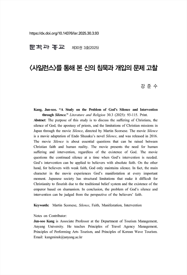 본 연구의 목적은 마틴 스콜세지 감독의 작품인 영화 <사일런스>를 통해서 기독교 신자들이 겪는 고난, 신의 침묵, 사제의 배교, 그리고 일본에서 기독교 선교의 한계점에 대한 논의라고 할 수 있다. 영화 <사일런스>는 엔도 슈사쿠)의 소설 침묵을 영화로 제작한 작품으로 2016년 개봉되었다. 영화 <사일런스> 는 기독교 신앙과 인간 현실 사이에서 제기될 수 있는 본질적 질문에 관한 것이 다. 영화는 신의 존재와 별개로 인간의 고통 지속과 개입의 필요성에 대해서 제 시하고 있다. 영화는 하나님의 개입이 필요한 시점에서 침묵이 이어지는 것에 대해서 의문을 제기한다. 신의 개입은 절대적 믿음을 지닌 신자들에게 적용될 수 있다. 반면 믿음이 약한 신자에게 신은 침묵만을 유지할 뿐이다. 실제로 영화 에서 주인공은 중요한 순간마다 신의 현현을 경험하고 있다. 일본 사회는 전통 적인 신앙 체계와 샤머니즘에 바탕을 두고 있는 천황의 실존성으로 인해서 기 독교가 진입하기 힘든 구조적 한계를 지니고 있다. 결론적으로 신의 침묵과 개 입의 문제는 신자들이 지닌 믿음의 관점에서 판단할 수 있다.