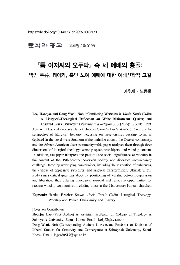 This study revisits Harriet Beecher Stowe’s Uncle Tom’s Cabin from the perspective of liturgical theology. Focusing on three distinct worship forms as depicted in the novel—the Southern white mainline church, the Quaker community, and the African American slave community—this paper analyzes them through three dimensions of liturgical theology: worship space, worshipers, and worship content. In addition, the paper interprets the political and social significance of worship in the context of the 19th-century American society and discusses contemporary challenges faced by worshiping communities, including the restoration of publicness, the critique of oppressive structures, and practical transformation. Ultimately, this study raises critical questions about the positioning of worship between oppression and liberation, thus offering theological renewal and reflective opportunities for modern worship communities, including those in the 21st-century Korean churches.