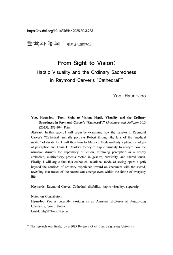 본 논문은 먼저 레이먼드 카버의 대성당 에서 화자가 로버트를 결핍의 인 물로 규정하고, 시각장애를 연민하거나 교정의 대상으로 간주하는 이른바 ‘의학 적 모델’의 관점을 통해 그를 바라보는 서술 전략을 세밀히 분석할 것이다. 뿐 만 아니라, 메를로-퐁티의 지각 현상학과 로라 U. 마크스의 ‘촉각적 시각성’ 이 론을 참조하여, 작품이 시각의 절대적 우위를 흔들고 인식을 몸짓·근접성·신체 적 접촉에 뿌리를 둔 다감각적 과정으로 재구성하는 방식을 고찰할 것이다. 나 아가, 본 논문은 이 작품이 이러한 체화되고 관계적인 ‘보기’의 방식을 통해 어 떻게 일상의 차원을 넘어 성스러움의 체험으로 나아가는 길을 열어 보이는지, 즉 평범한 삶의 순간들 속에서도 신성함이 드러날 수 있음을 어떤 미학적·윤리 적 방식으로 제시하는지를 고찰할 것이다.