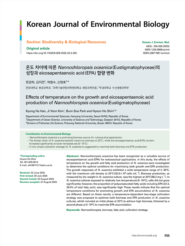Nannochloropsis oceanica has been recognized as a valuable source of eicosapentaenoic acid (EPA) for nutraceutical applications. In this study, the effects of temperature on the growth and fatty acid production of N. oceanica were investigated to determine the optimal conditions for maximizing both growth and EPA production. The growth responses of N. oceanica exhibited a wide temperature range of 5-30°C, with the maximum cell density at 25°C (35.9×105 cells mL-1). Biomass production, as measured by dry weight in N. oceanica culture, was the highest at 20°C (86.2 mg L-1). In N. oceanica cultures exposed to relatively low temperatures (5-10°C), cells did not grow significantly; however, the proportion of polyunsaturated fatty acids including EPA (22.3, 26.0% of total fatty acid), was significantly high. These results indicate that the optimal temperature conditions for promoting growth and EPA accumulation of N. oceanica are different. Based on these results, a temperature-dependent two-stage cultivation strategy was proposed to optimize both biomass and EPA production in N. oceanica cultures, which included an initial phase at 20°C to achieve high biomass, followed by a second phase at 5-10°C to maximize EPA accumulation.