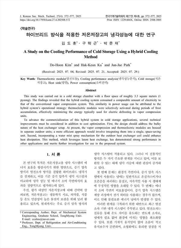 This study was carried out in a cold storage chamber with a floor space of roughly 3.3 square meters (1 pyeong). The findings revealed that the hybrid cooling system consumed a comparable amount of electricity to that of the conventional vapor compression system. This similarity in power usage can be attributed to the hybrid system’s operational strategy: thermoelectric modules were selectively activated during periods of frost accumulation, effectively minimizing the energy typically used for electric defrosting in vapor compression units. To advance the commercialization of this hybrid system in cold storage applications, several technical improvements must be considered in addition to cost optimization. First, the design should address the bulky nature of the heat exchanger setup. At present, the vapor compression and thermoelectric modules are housed in separate outdoor units; a more efficient approach would involve integrating them into a single, space-saving unit. Second, incorporating a water mist spray mechanism for the outdoor heat exchanger coil could enhance heat dissipation. This method, which leverages latent heat exchange, has demonstrated strong performance in other applications and merits further investigation for use in the proposed system.
