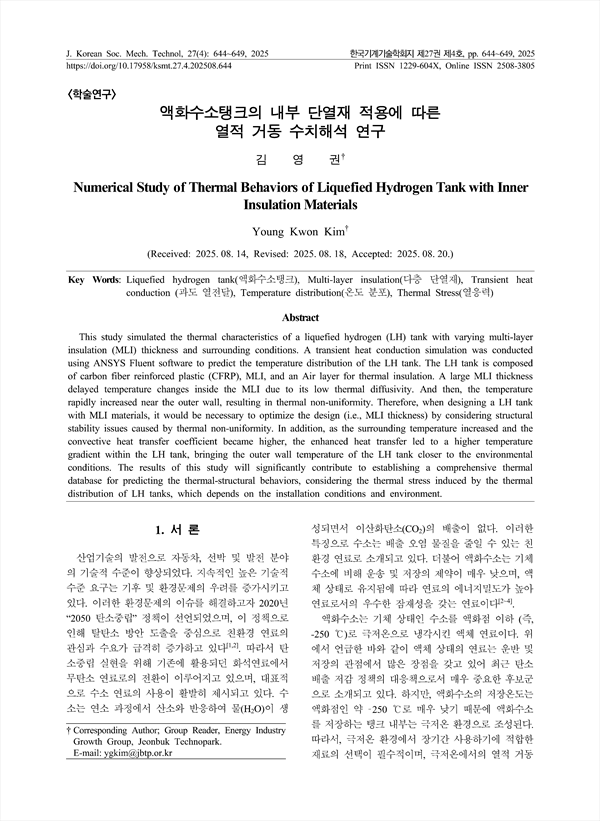 This study simulated the thermal characteristics of a liquefied hydrogen (LH) tank with varying multi-layer insulation (MLI) thickness and surrounding conditions. A transient heat conduction simulation was conducted using ANSYS Fluent software to predict the temperature distribution of the LH tank. The LH tank is composed of carbon fiber reinforced plastic (CFRP), MLI, and an Air layer for thermal insulation. A large MLI thickness delayed temperature changes inside the MLI due to its low thermal diffusivity. And then, the temperature rapidly increased near the outer wall, resulting in thermal non-uniformity. Therefore, when designing a LH tank with MLI materials, it would be necessary to optimize the design (i.e., MLI thickness) by considering structural stability issues caused by thermal non-uniformity. In addition, as the surrounding temperature increased and the convective heat transfer coefficient became higher, the enhanced heat transfer led to a higher temperature gradient within the LH tank, bringing the outer wall temperature of the LH tank closer to the environmental conditions. The results of this study will significantly contribute to establishing a comprehensive thermal database for predicting the thermal-structural behaviors, considering the thermal stress induced by the thermal distribution of LH tanks, which depends on the installation conditions and environment.