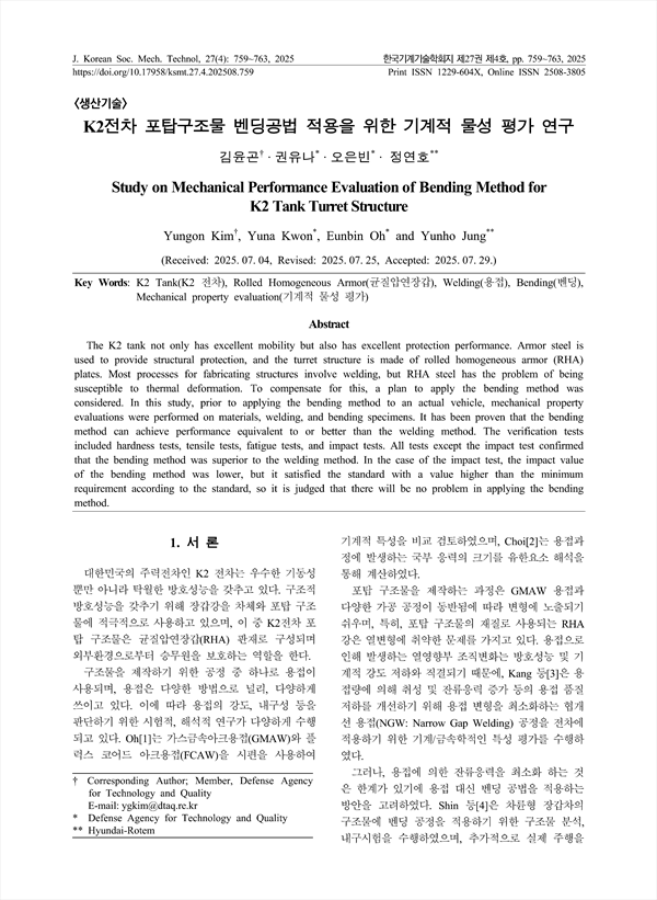 K2전차 포탑구조물 벤딩공법 적용을 위한 기계적 물성 평가 연구 KCI 등재