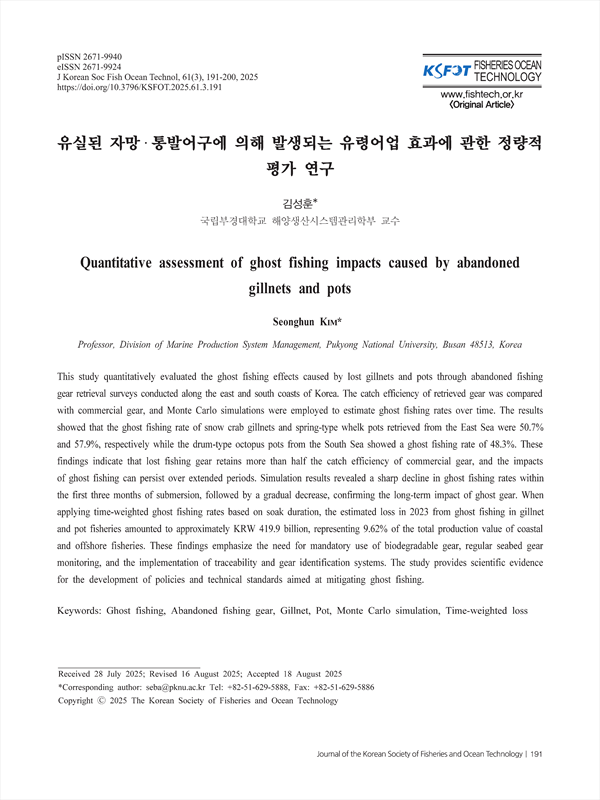 This study quantitatively evaluated the ghost fishing effects caused by lost gillnets and pots through abandoned fishing gear retrieval surveys conducted along the east and south coasts of Korea. The catch efficiency of retrieved gear was compared with commercial gear, and Monte Carlo simulations were employed to estimate ghost fishing rates over time. The results showed that the ghost fishing rate of snow crab gillnets and spring-type whelk pots retrieved from the East Sea were 50.7% and 57.9%, respectively while the drum-type octopus pots from the South Sea showed a ghost fishing rate of 48.3%. These findings indicate that lost fishing gear retains more than half the catch efficiency of commercial gear, and the impacts of ghost fishing can persist over extended periods. Simulation results revealed a sharp decline in ghost fishing rates within the first three months of submersion, followed by a gradual decrease, confirming the long-term impact of ghost gear. When applying time-weighted ghost fishing rates based on soak duration, the estimated loss in 2023 from ghost fishing in gillnet and pot fisheries amounted to approximately KRW 419.9 billion, representing 9.62% of the total production value of coastal and offshore fisheries. These findings emphasize the need for mandatory use of biodegradable gear, regular seabed gear monitoring, and the implementation of traceability and gear identification systems. The study provides scientific evidence for the development of policies and technical standards aimed at mitigating ghost fishing.